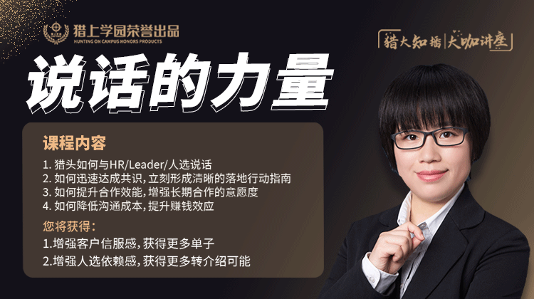 课程内容: 1. 猎头如何与HR/Leader/人选说话 2. 如何迅速达成共识,立刻形成清晰的落地行动指南 3. 如何提升合作效能,增强长期合作的意愿度 4. 如何降低沟通成本,提升赚钱效应 您将获得: 1.增强客户信服感,获得更多单子 2.增强人选依赖感,获得更多转介绍可能